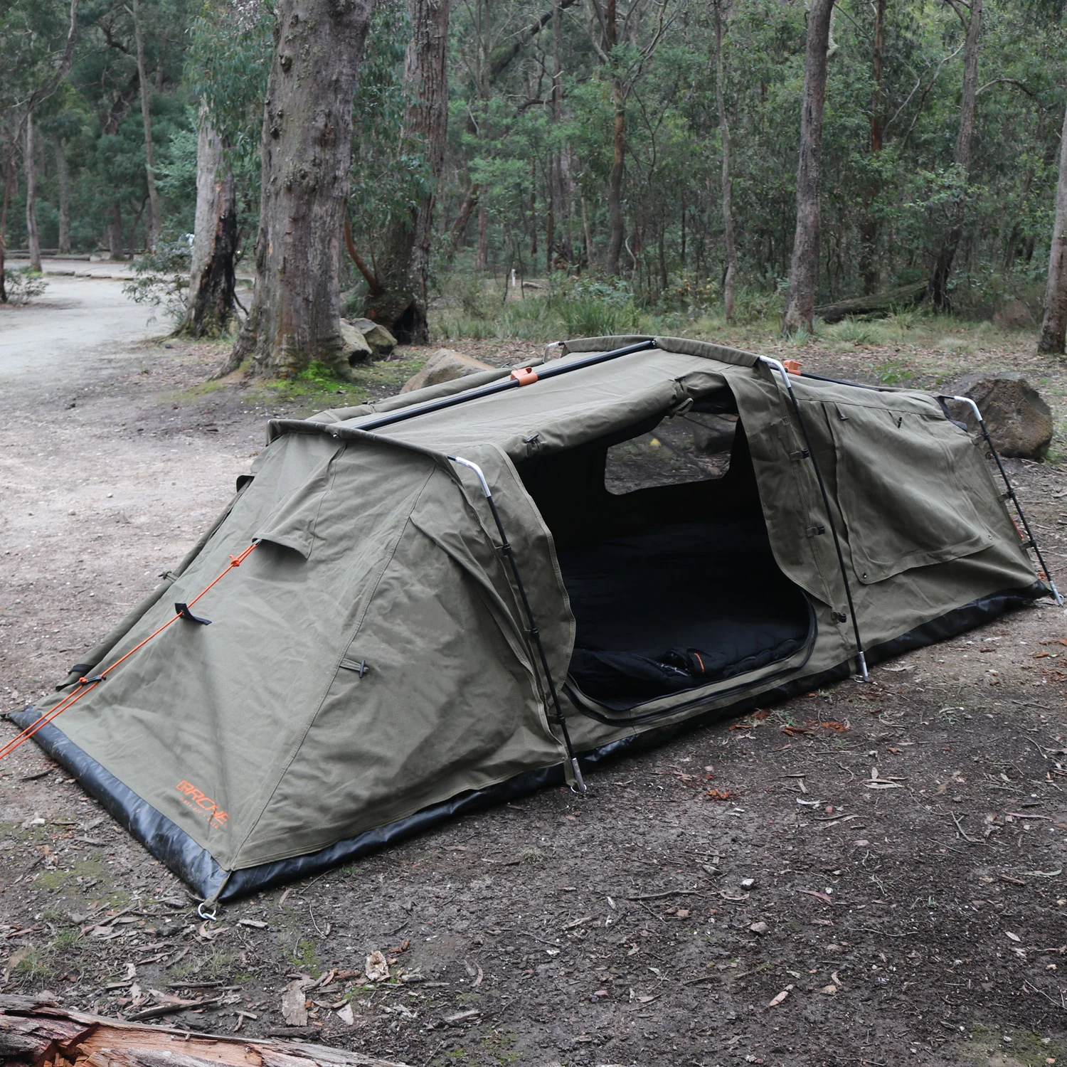 The Dirty Dee Plus + swag is made from premium 420gsm ripstop polycotton canvas with an impressive 800mm waterhead rating. There’s also internal seam sealing and a reinforced, heavy-duty 600gsm PVC bucket floor to keep you dry in those rainy conditions. It comes with a premium quality, high-density 70mm foam mattress with a removable cover. The canvas swag bag is perfect for storage and protection while you’re on the go - just throw it in the back of the car or on the roof rack and get on the road.
